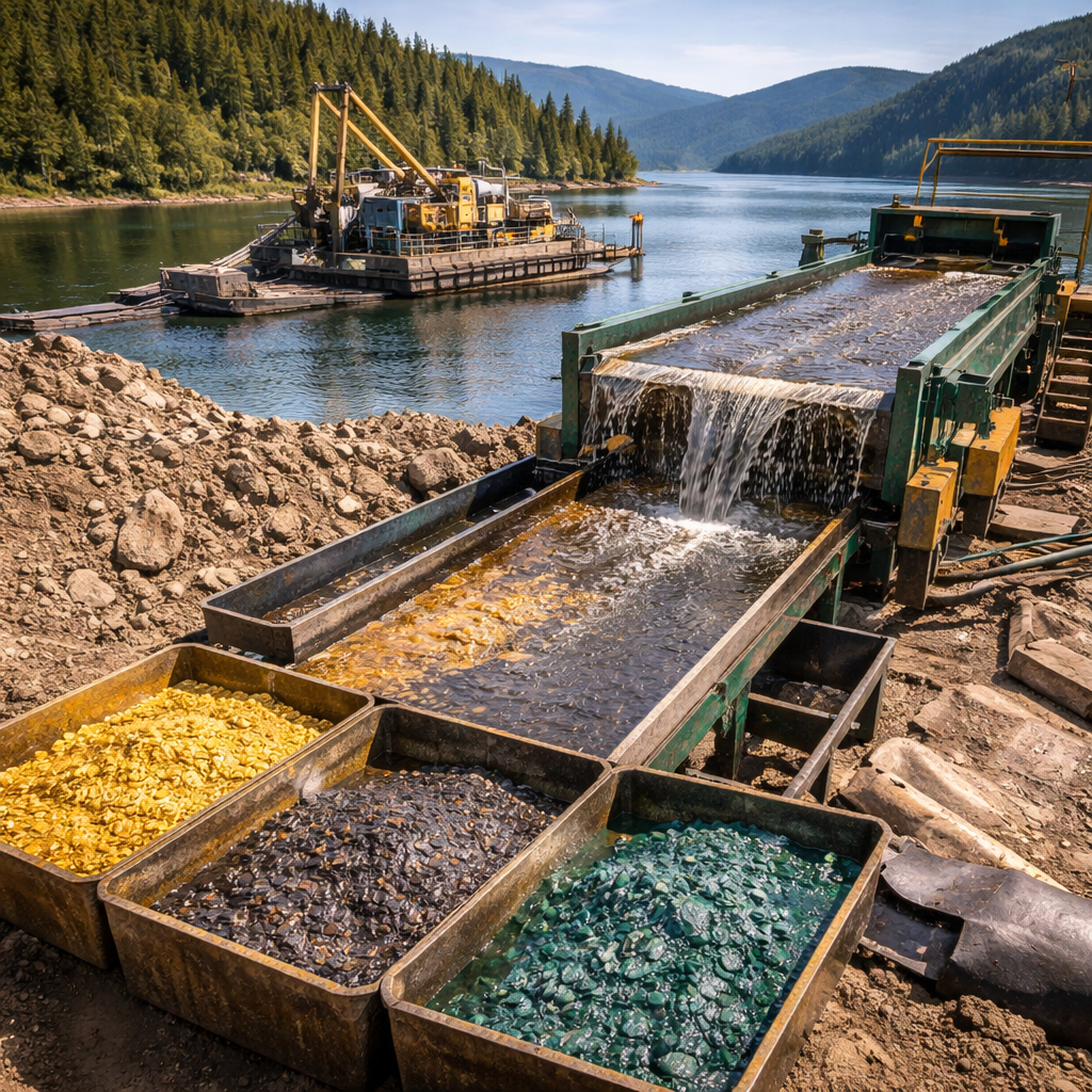 The project begins with bulk sampling and on-site processing to validate recovery rates. If economic viability is confirmed, NAG scales into a full dredging operation using modular barges, pumps, concentrators, and shaker tables.